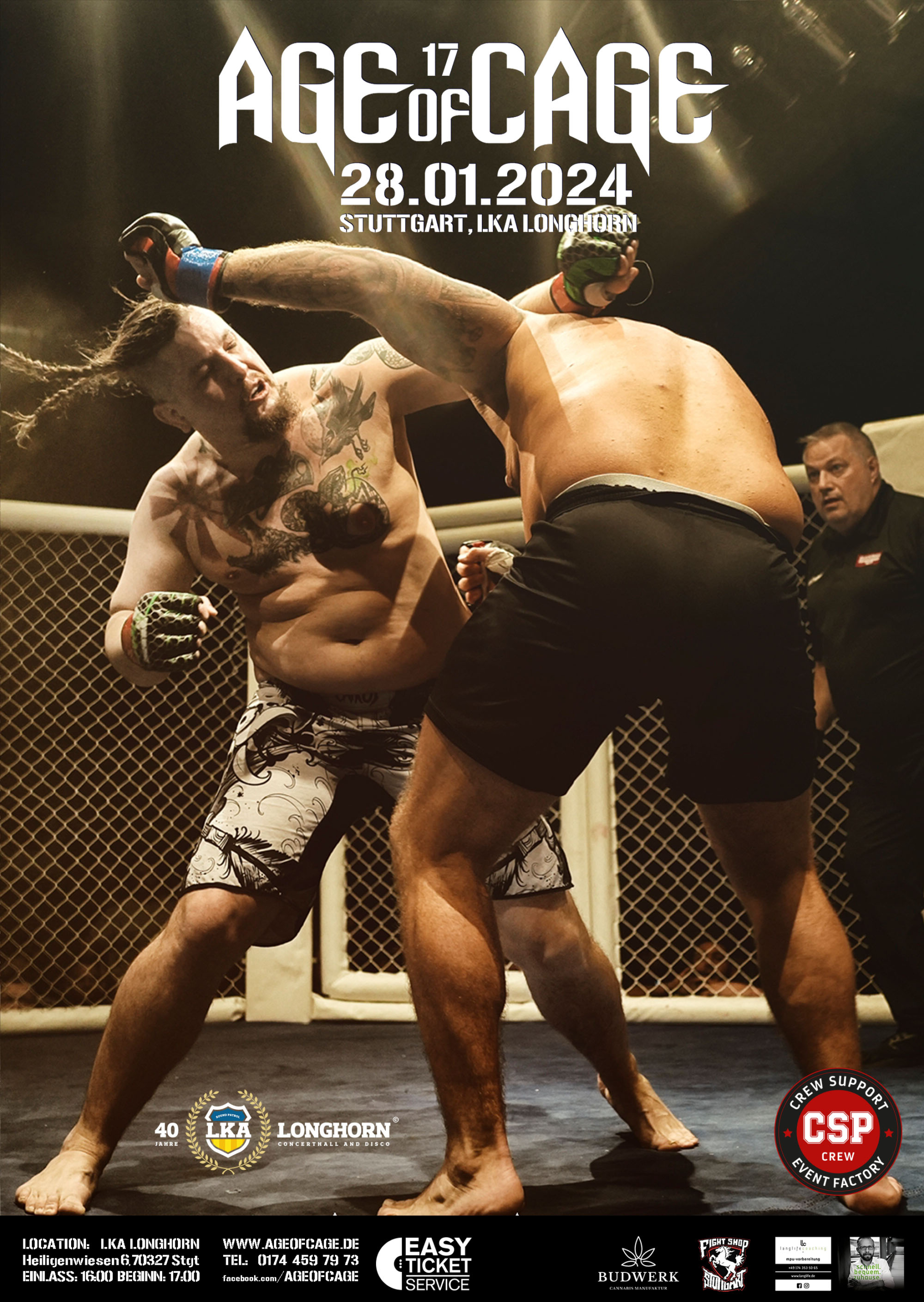 Am Sonntag, den 28.01.2024, findet die 17. Auflage der schwäbischen Kampfsport Eventreihe AGE OF CAGE statt. An diesem Tag verwandelt sich das LKA Longhorn von einer Konzerthalle in eine Kampfarena. Bis zu dreißig Kämpferinnen und Kämpfer stellen an diesem Abend ihr Können unter Beweis. Die Kämpfe (alle im Vollkontakt) werden nach K1 oder MMA-Regelwerk ausgetragen. Natürlich liegt der Fokus bei der Kämpferbuchung wieder auf den Sportlern aus der Region.
