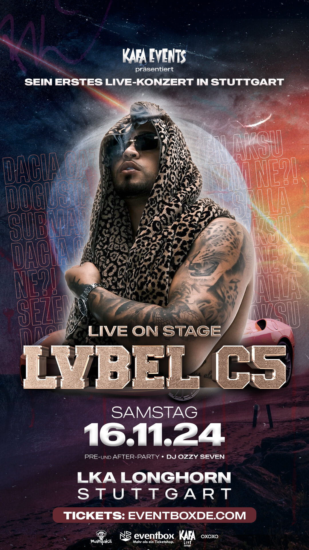 LVBEL C5 wird seine besten Hits und neue Überraschungen präsentieren. Mit beeindruckenden visuellen Shows und einer energiegeladenen Bühnenperformance wird dieses Konzert ein absolutes Muss für alle Fans der türkischen Rapmusik sein.