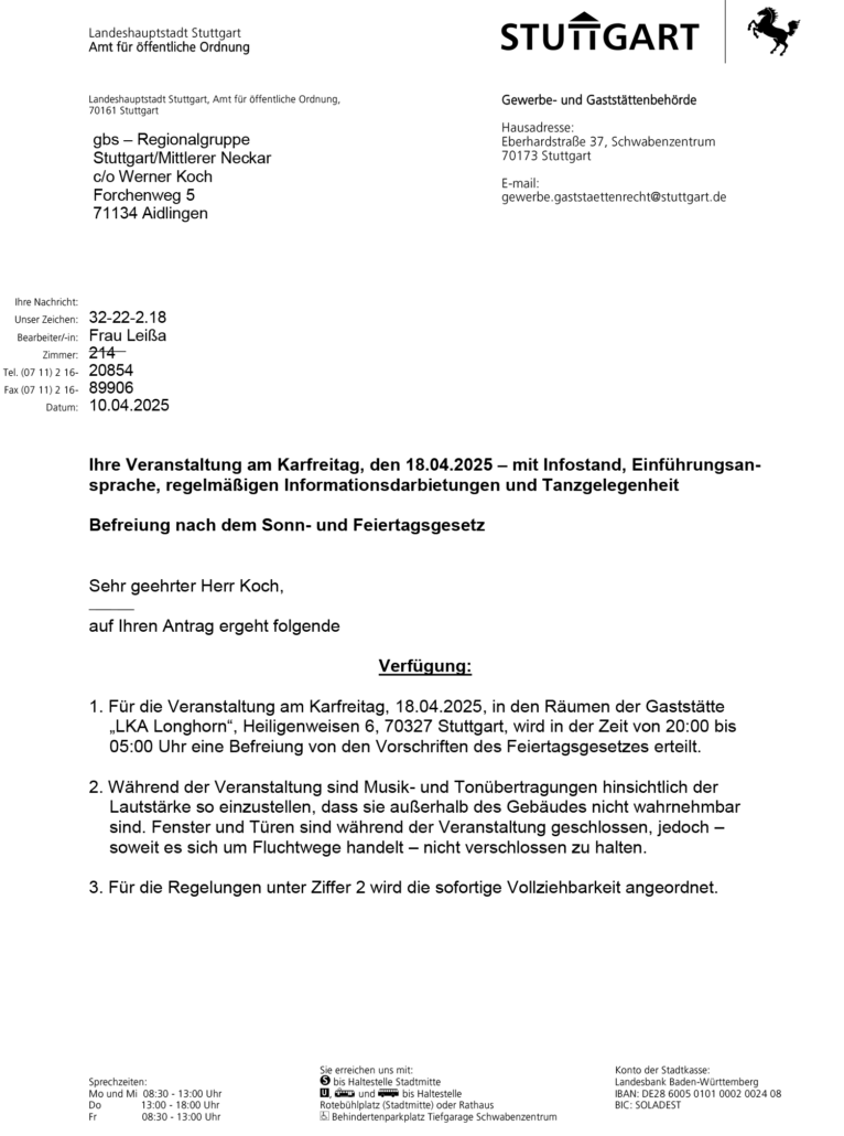 Ausnahmegenehmigung vom Feiertagsgesetz erteilt -> Informations PDF